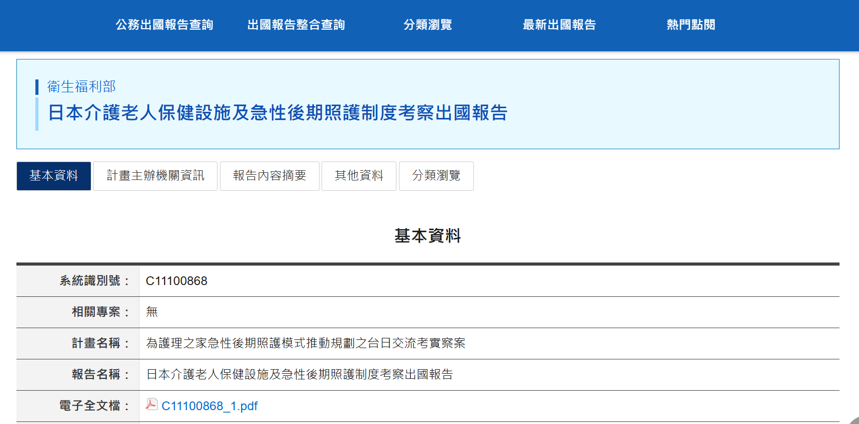 全程充分研習日本照護制度與PAC相關機構之營運效益,衛福部已於日前上傳公布出國考察報告,敬請參閱下方公務出國報告資訊網連結, 謹此轉達週知。