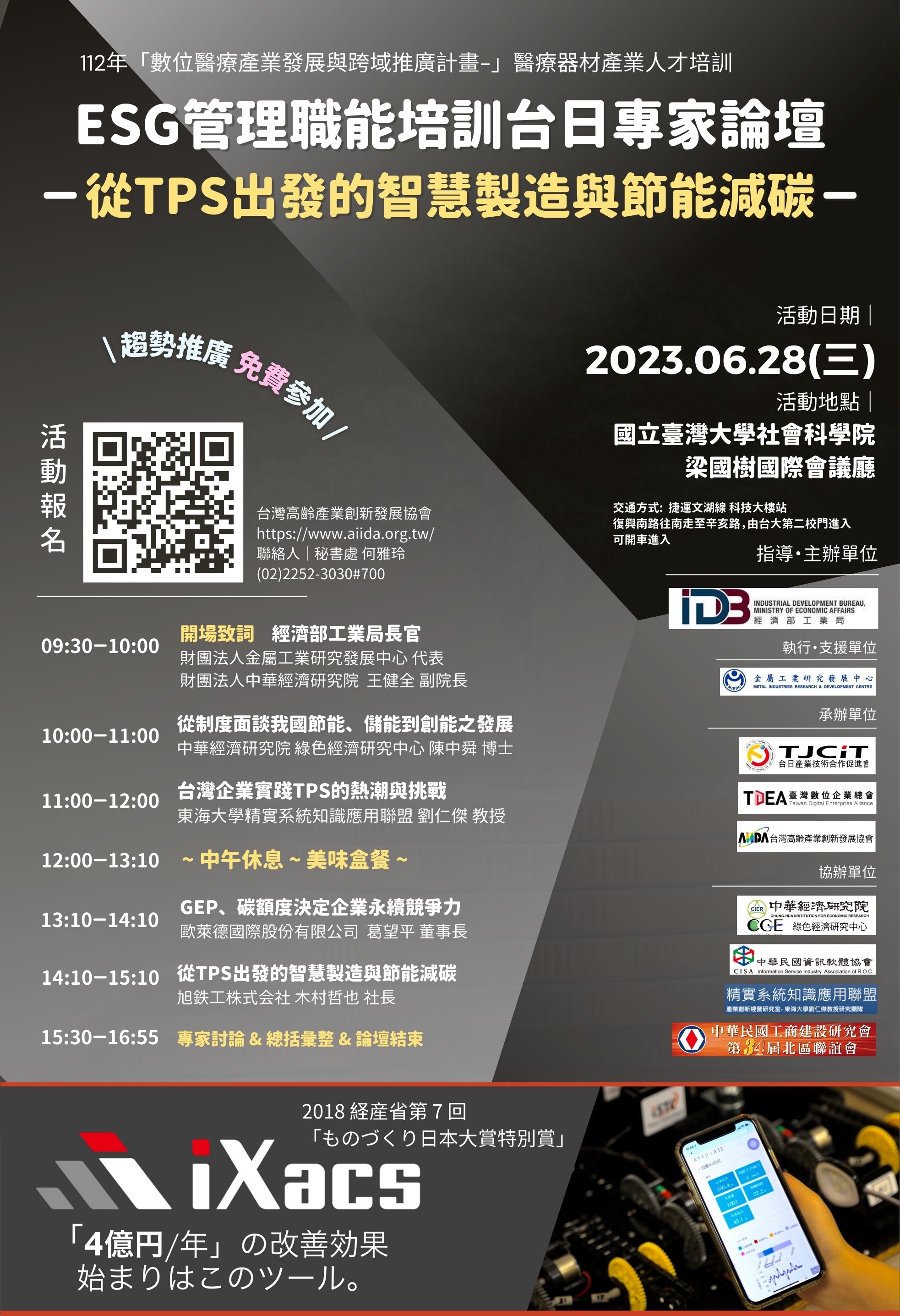 本會承辦由經濟部工業局主辦、財團法人金屬工業研究發展中心執行之112年數位醫療產業發展與跨域推廣計畫「ESG管理職能培訓台日專家論壇-從TPS出發的智慧製造與節能減碳」,2023年6月28日 09:30於國立臺灣大學社會科學院 梁國樹會議廳隆重開幕,熱鬧登場。