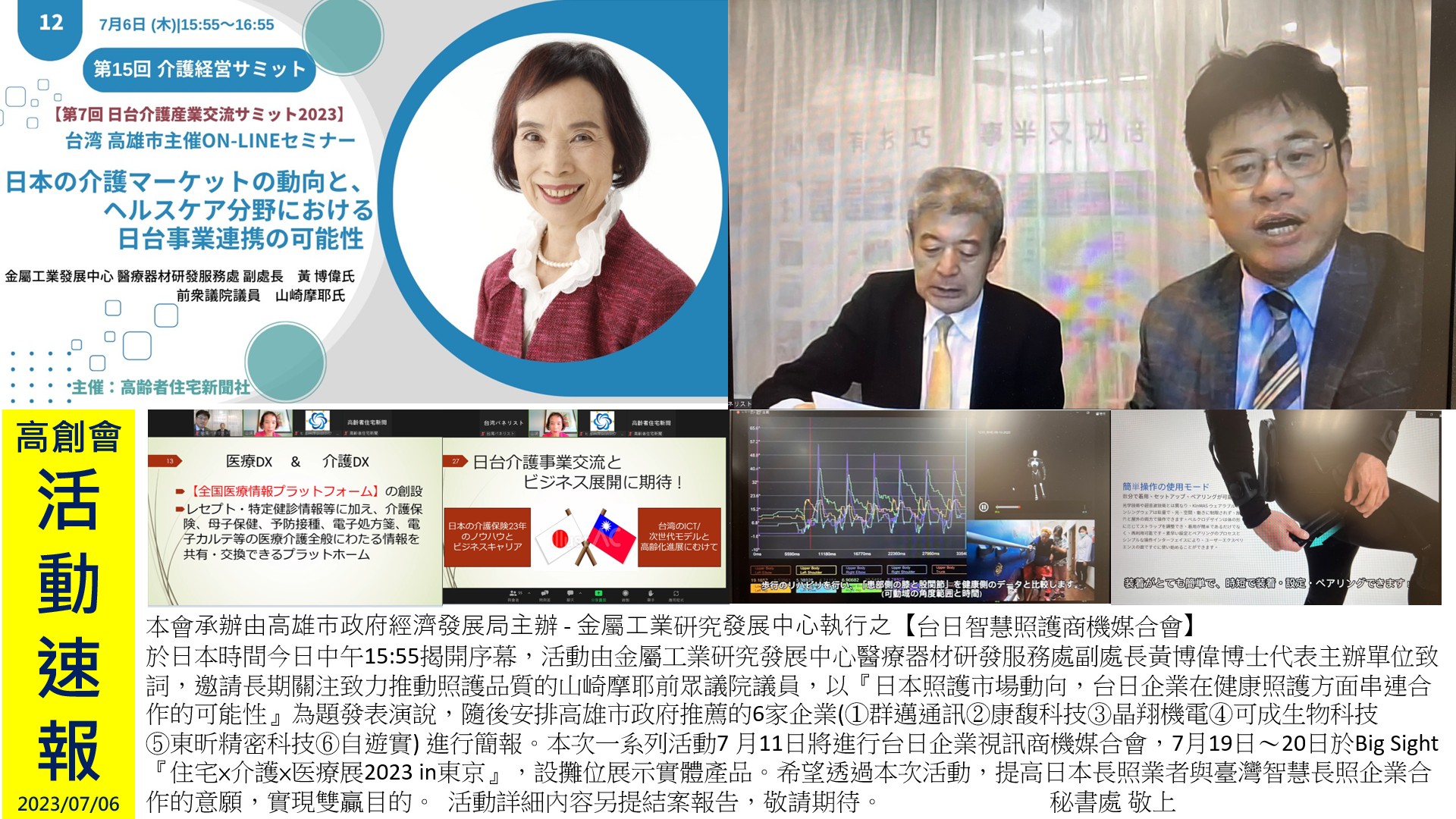 本次一系列活動7 月11日將進行台日企業視訊商機媒合會,7月19日〜20日於Big Sight『住宅×介護×医療展2023 in東京』,設攤位展示實體產品。