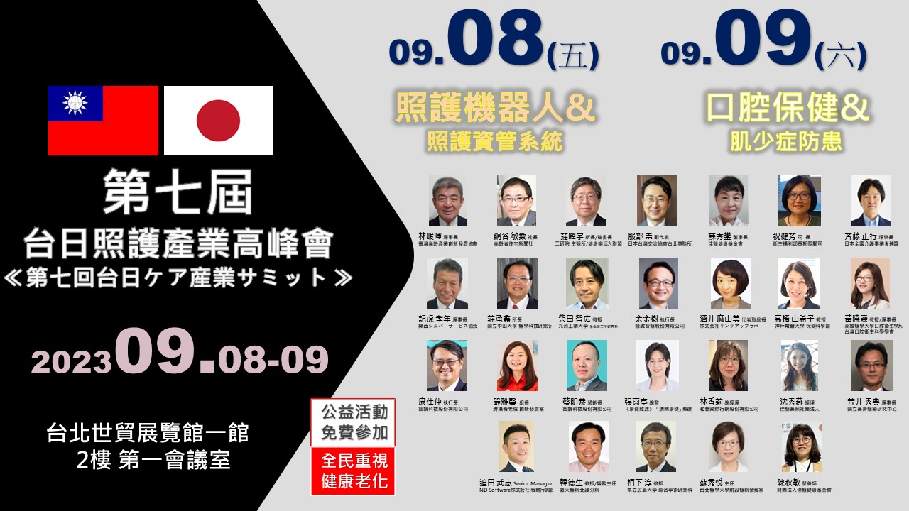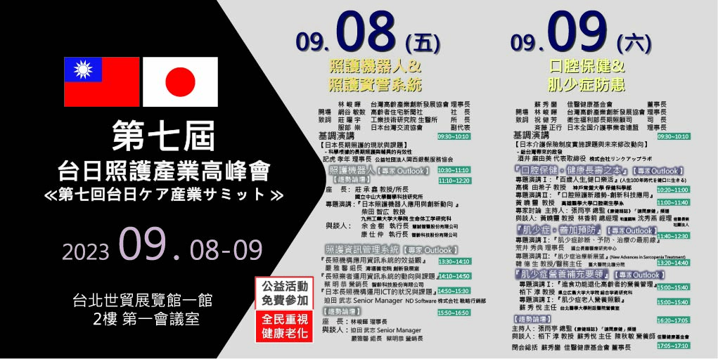 2023/09/08 台日照護科技論壇,以照護機器人與照護資訊管理系統為主題 ; 2023/09/09 台日照護技術論壇,以口腔保健與肌少症防患為主題。