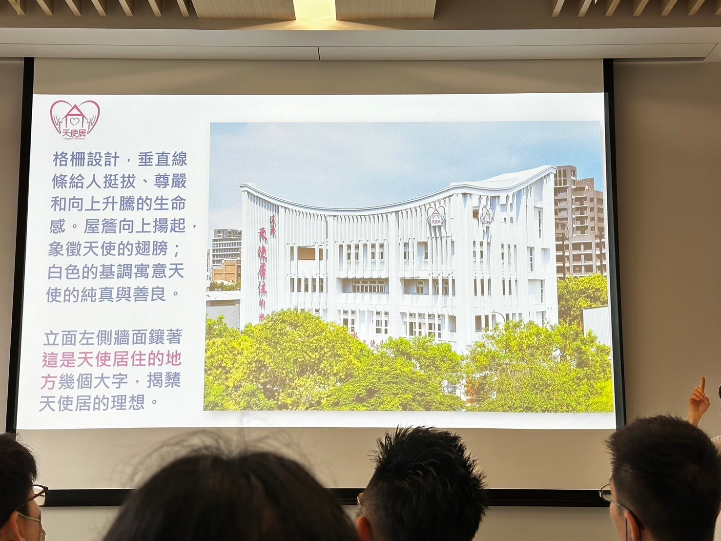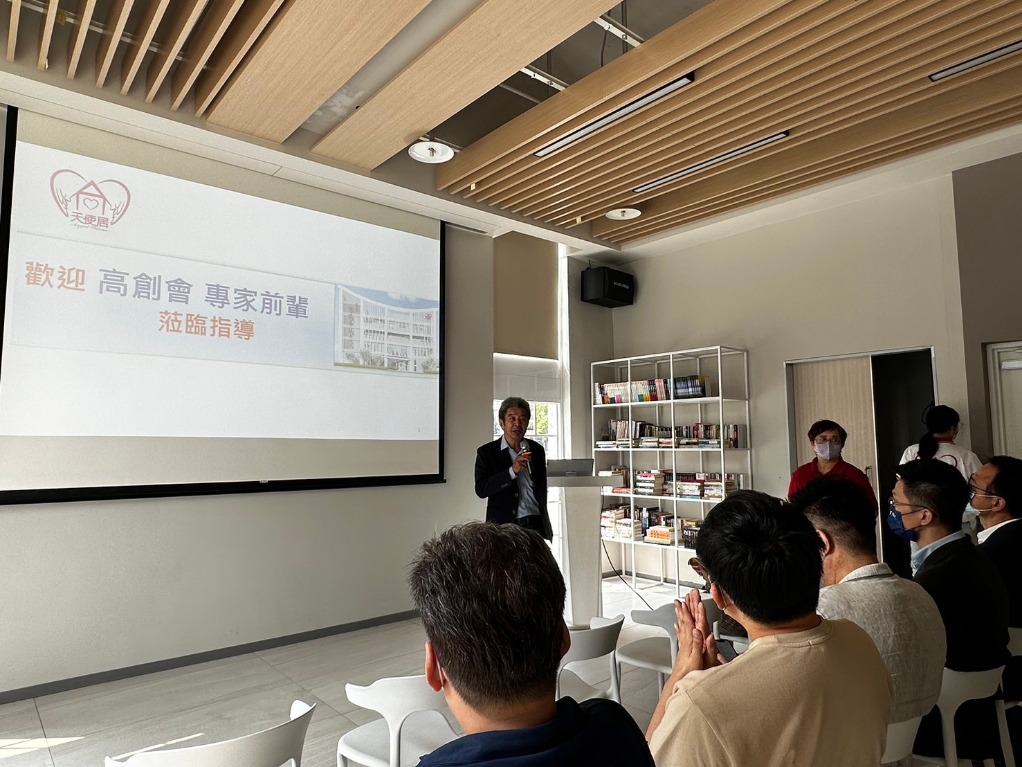『天使居長照財團法人-鑫淼天使居』為新北首間同時具備社區和住宿功能的綜合式長照機構,目前的環境規劃,一樓是餐廳、二樓是失能照顧、三樓日照中心、四樓失智家園、還有五樓空中花園,以政府提供的獨居低收長者安養為主,有44個床位、可容納60位日照長者。特別安排接待導覽人員先為高創會會員進行簡報,再帶領大家認識天使居。