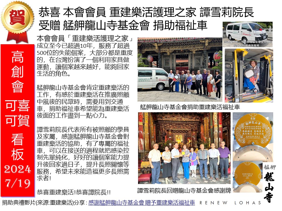 捐助儀式活動影片詳見下方連結:感謝艋舺龍山寺基金會 贈予重建樂活福祉車