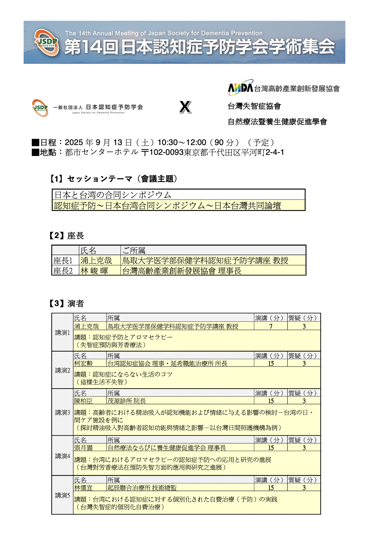 本會受邀組團參加「第14屆日本失智症預防學會學術大會」,並於大會期間推出「日本-台灣共同論壇」。台灣專家將於會場發表失智症預防(一次〜三次)相關專題精湛演說,本會另於大會前後安排Ⅻ日本照護技術研習贏 – (失智症專家團),前往日本失智照護重鎮交流研習。敬請期待,並持續惠予關注和支持!